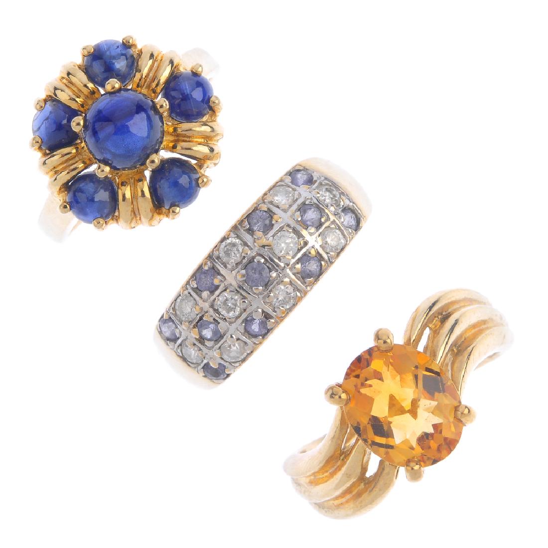 Four 9ct gold gem-set rings. To include a chrysoberyl