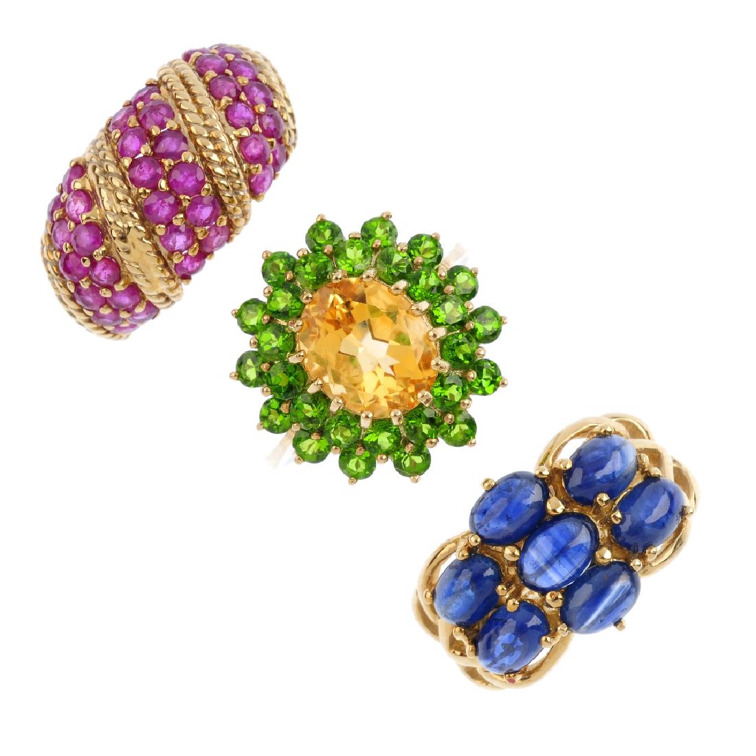 Four 9ct gold gem-set rings. To include a ruby dress
