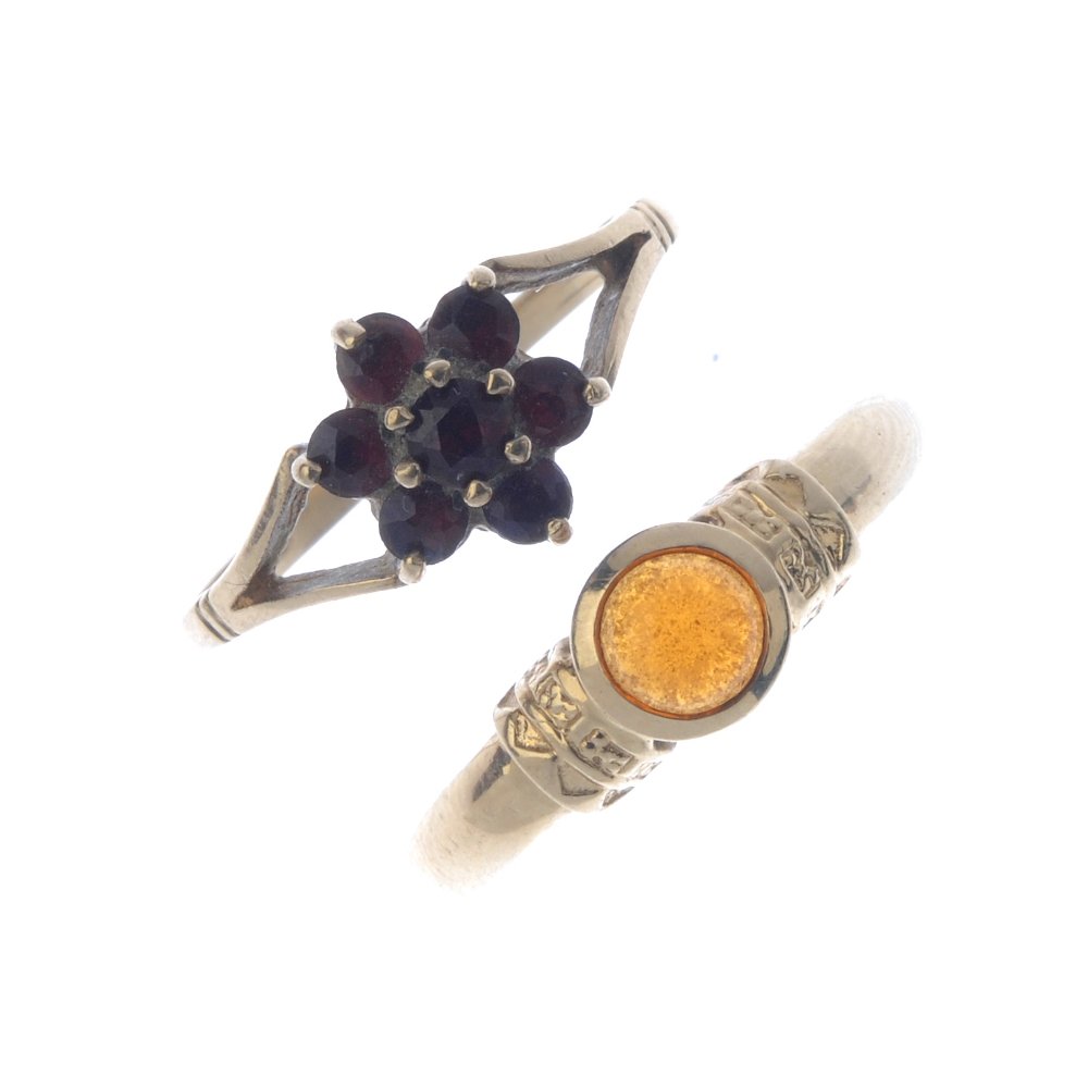 Four 9ct gold gem-set rings. To include garnet cluster