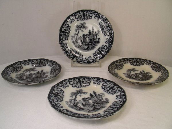 FOUR ANTIQUE BLACK TRANSFERWARE PLATES ATHENS
