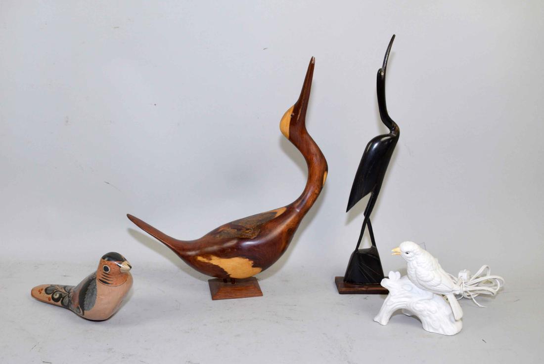 FOUR ASSORTED BIRDS. One is a light. Largest: 15''H.