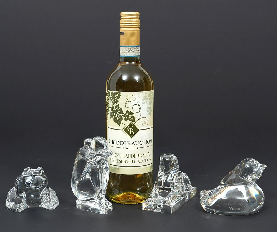 SoldBaccarat French Crystal Heart & Animal Figures LOTA four (4) piece estate lot of Baccarat French crystal paperweight sculptures. Clear art glass in various designs. Includes: one (1) red art glass heart form paperweight with etched dedication; one (1See Sold Price