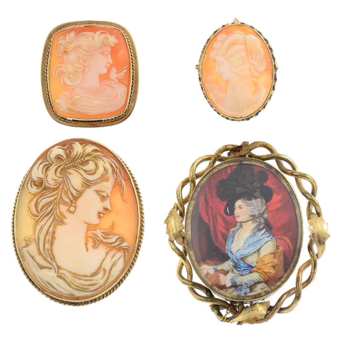 Four brooches. To include three shell cameo brooches,