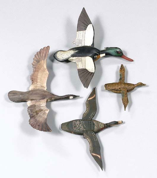 Four carved miniature ducks in flight