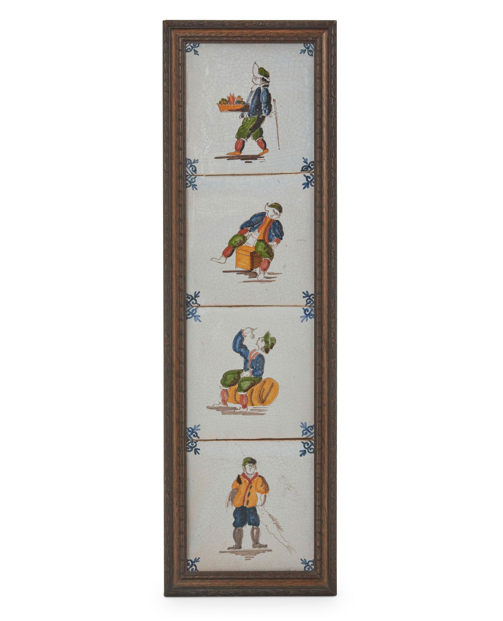 Four Dutch framed figural ceramic tiles