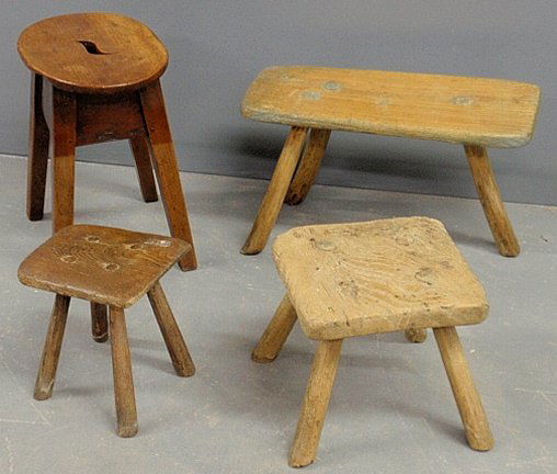 Four English primitive milking stools, largest 14”h.