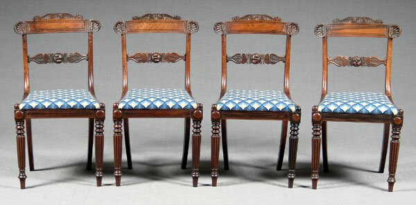 SoldFOUR REGENCY SIDE CHAIRS.England, 19th Century. Mahogany. Crests with rounded ends and foliate carving, foliate carved splats, paneled front chair rails with turned and paneled front legs. Upholstered slip seats. 18.5" seat hSee Sold Price