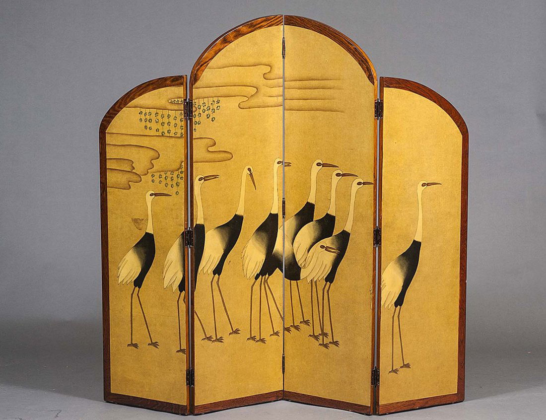 SoldA Japanese four fold painted floor screenA Japanese four fold painted floor screenheight 69in (175cm); largest width 80in; depth 5in. (13cm) Provenance:Property from a Private Collection, Southern California.See Sold Price
