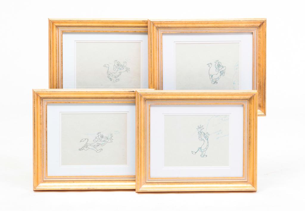 FOUR FRAMED CARTOON PRODUCTION DRAWINGS.
