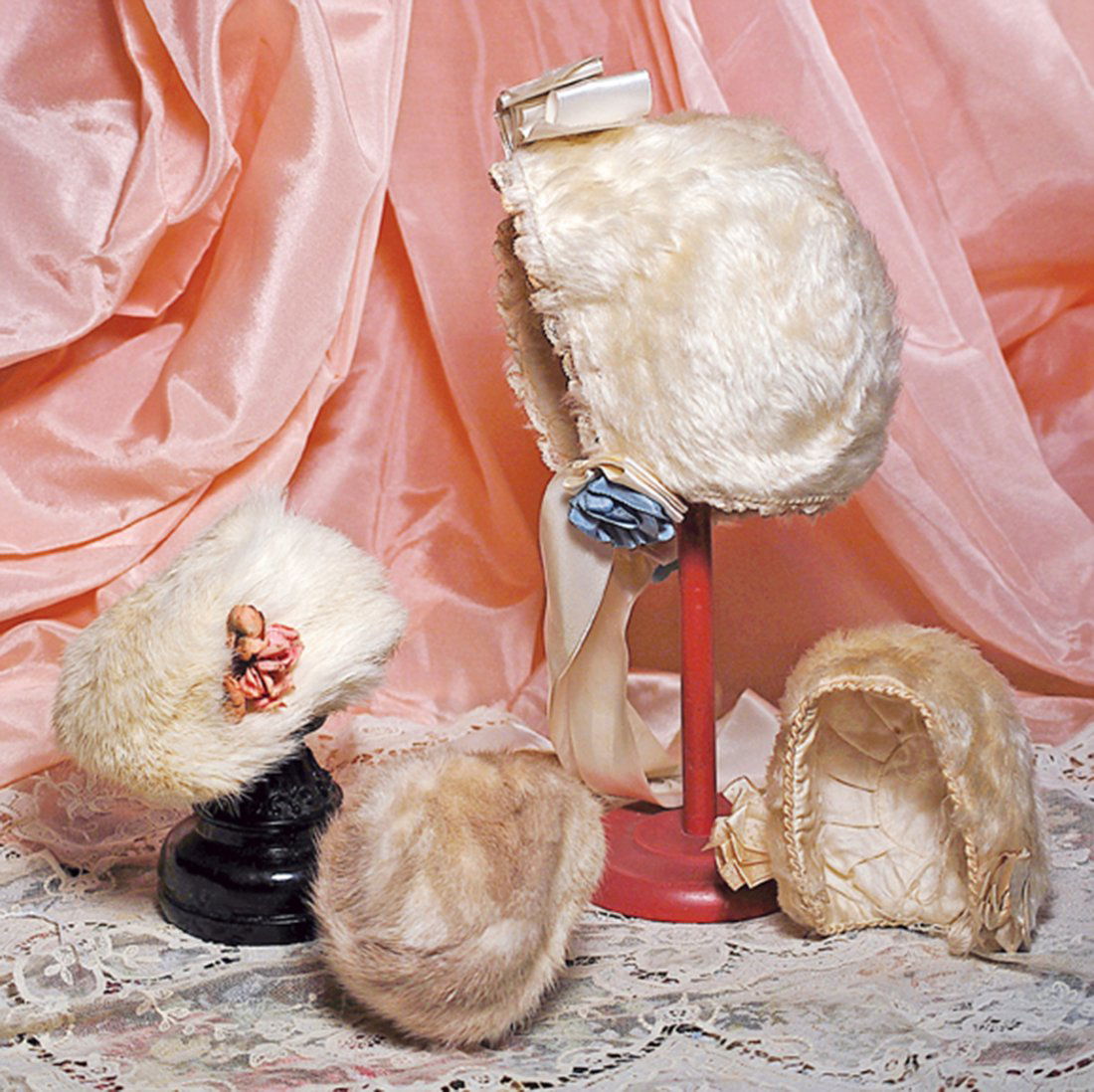 FOUR FUR DOLL BONNETS. Includes: (1) Large white fur