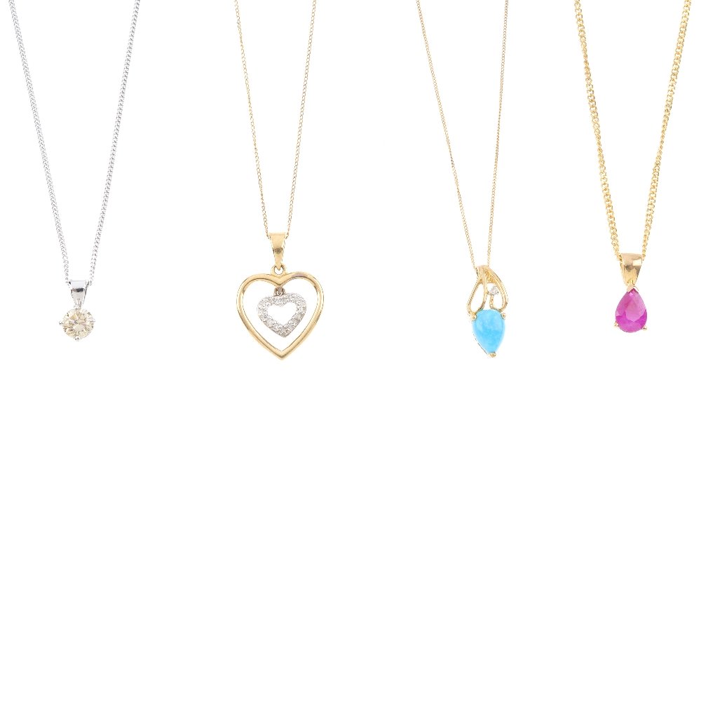 Four gem-set pendants. To include a pear-shape ruby
