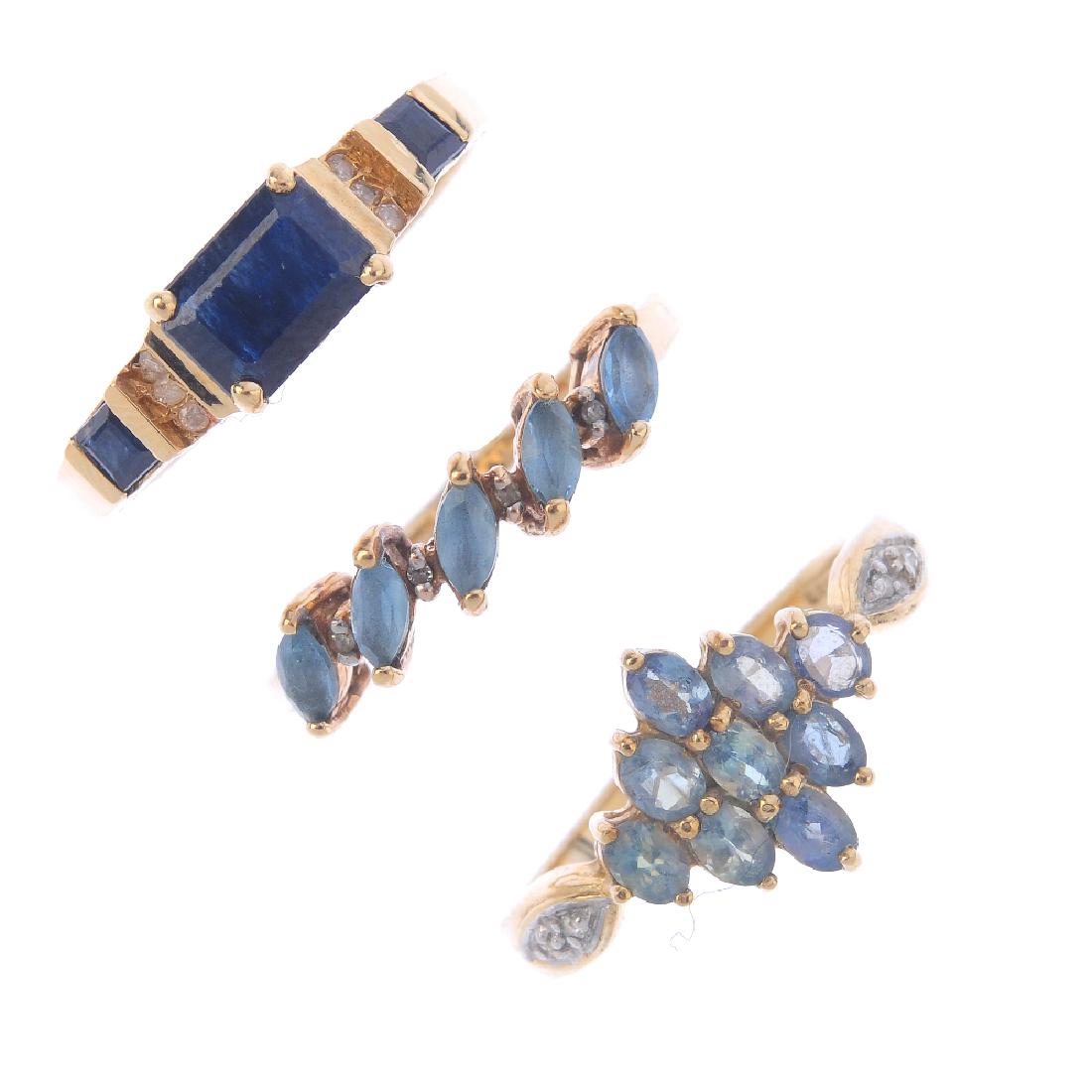 Four gem-set rings and one ring mount. To include a 9ct