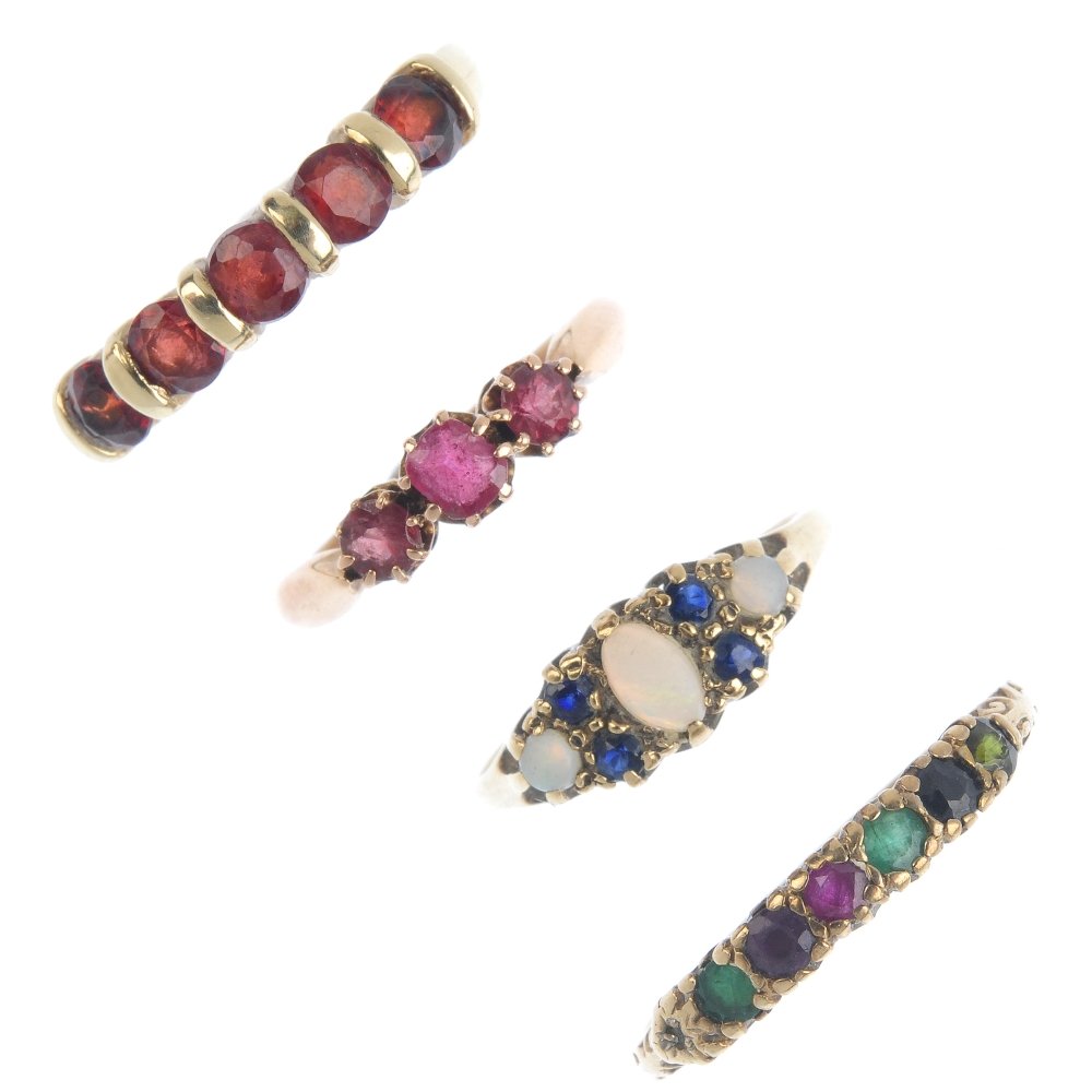 Four gem-set rings. To include a 9ct gold 'Dearest'