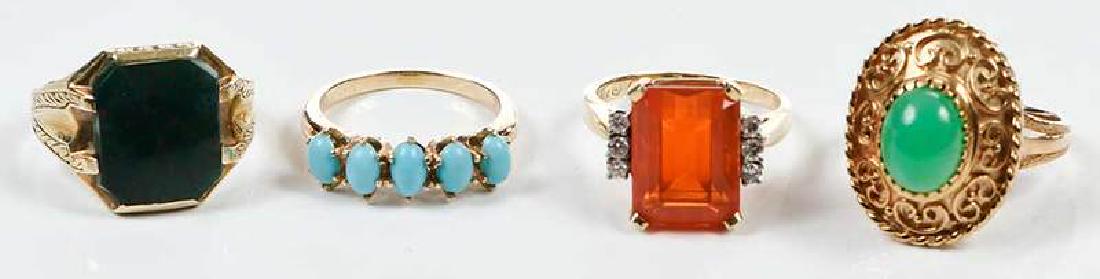 SoldFOUR 14KT GOLD AND GEMSTONE RINGS Approx. 15.49 total dwt.FOUR 14KT GOLD AND GEMSTONE RINGS1) Oval jade, approx. 10.0 x 14.0mm. Size 5?.2) Round cat?s eye, diameter approx. 12.0mm. Size 5?.3) Oval garnet, approx. 7.0 x 9.0mm. Size 5?.4) Three oval pieces ofSee Sold Price