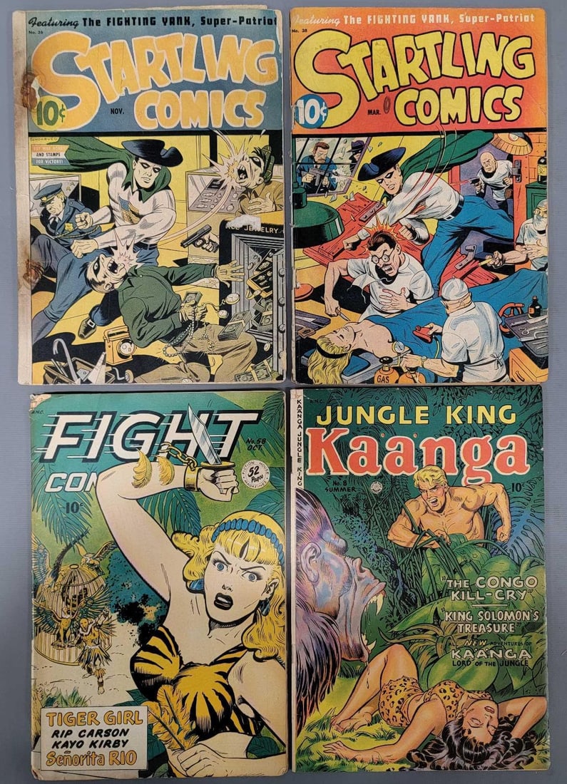 SoldFour Golden Age ComicsFour Golden Age Comics, Startling Comics 36 rusty staples and heavy spine roll. Startling Comics 38 FAIR tears and brittle. Fight Comics 58 corners are chipped. Jungle King Kanga 8 chipped top left, sSee Sold Price