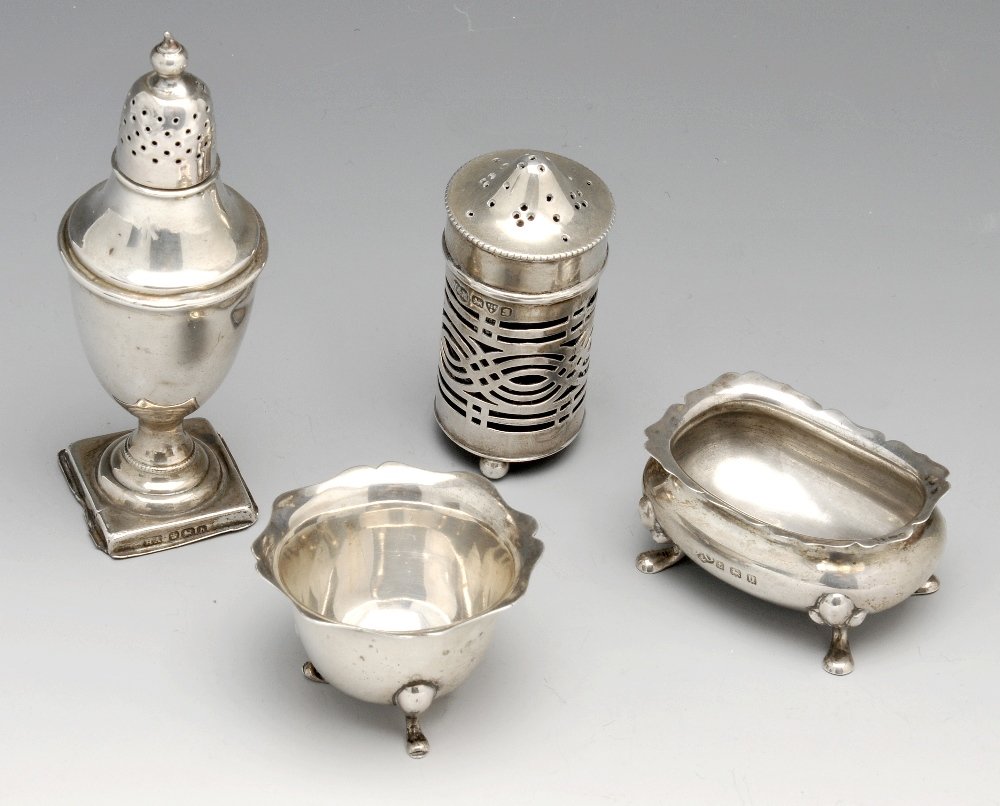 Four items including two open salts, pepper pot and