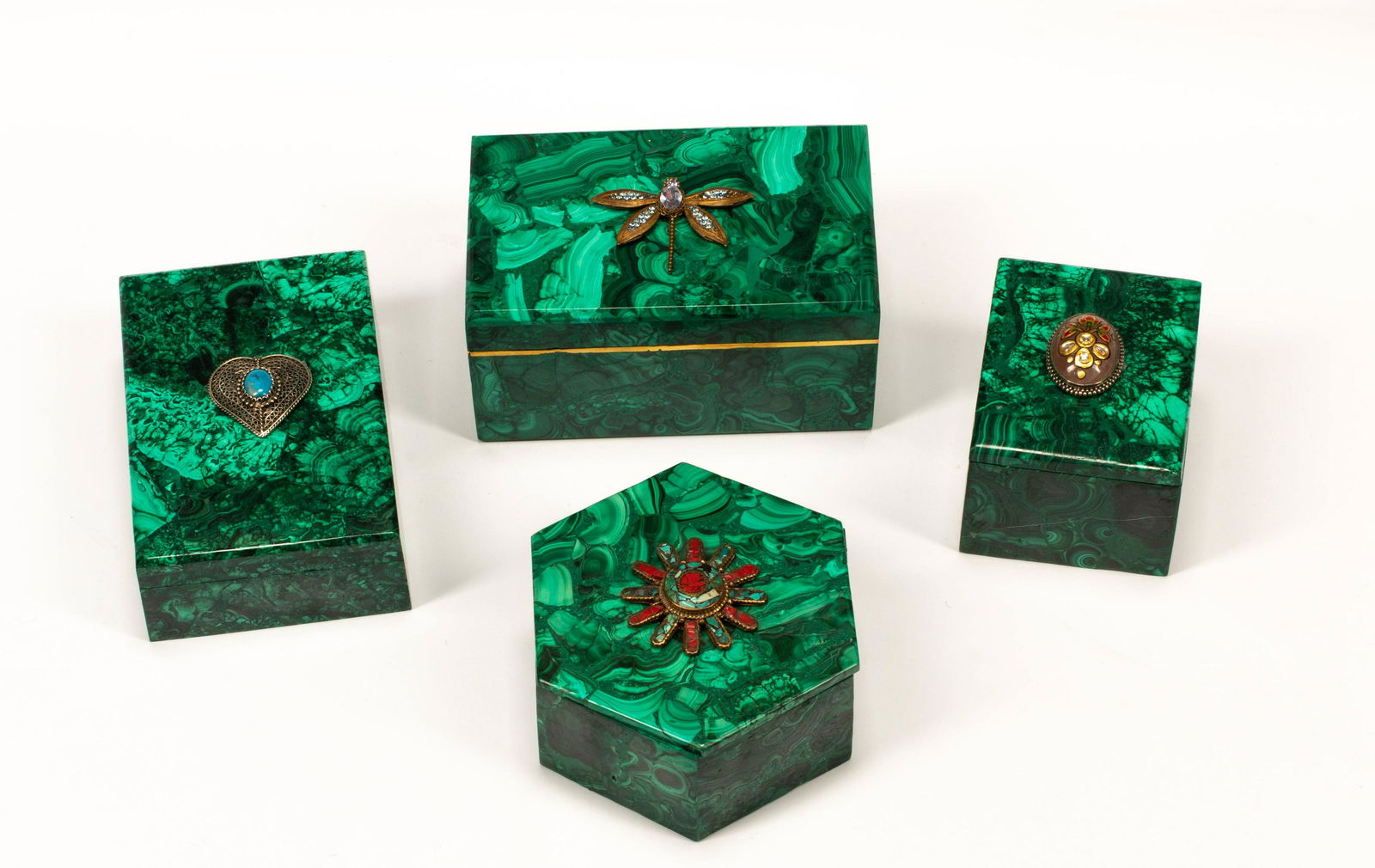 Four "Jeweled" Malachite Table Boxes