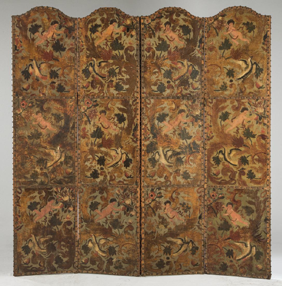 Four-leaf folding screen in embossed, polychrome and