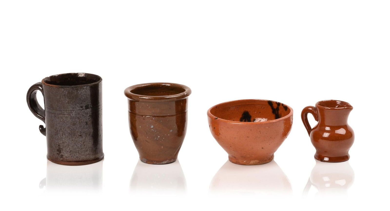 FOUR MINIATURE NEW ENGLAND REDWARE ITEMS.