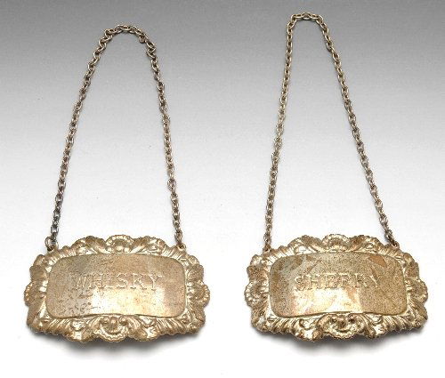SoldGroup of Five Silver Bottle Ticket Labels and aGroup of Five Silver Bottle Ticket Labels and a Christofle Silver Plate Bottle Opener The labels comprising: Bourbon, marked Birmingham Cognac, marked Birmingham Scotch, marked Birmingham Port, markedSee Sold Price