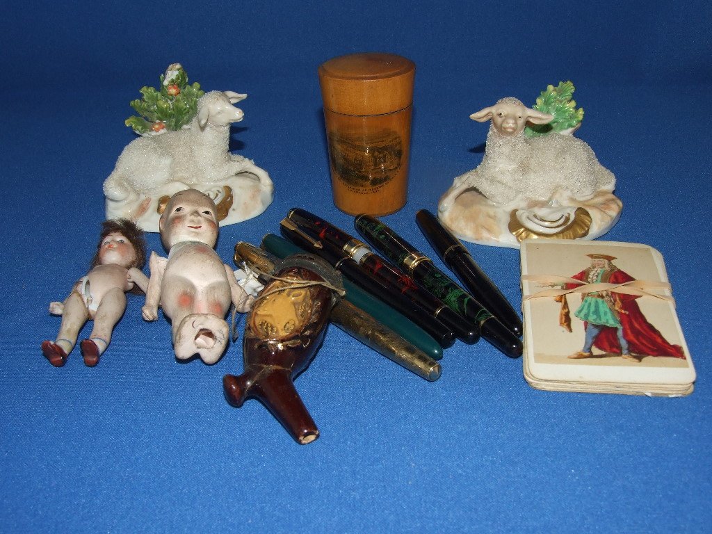 Four Parker fountain pens, assorted postcards,