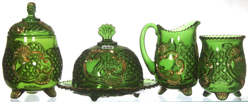 FOUR PIECE GREEN CROESUS PATTERN GLASS TABLE SET