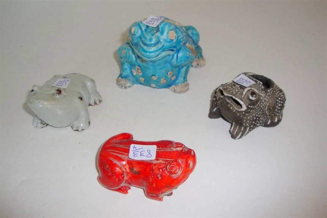 FOUR POTTERY FROG FIGURES