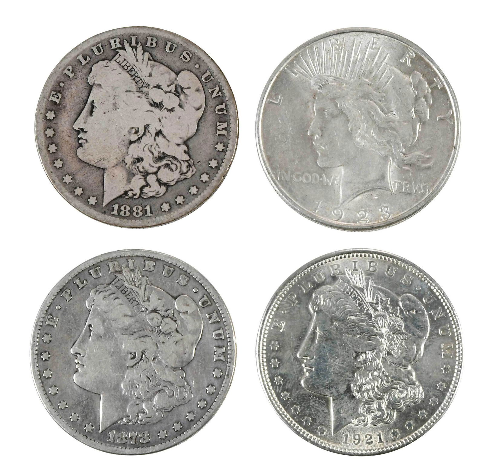 ASSORTED 90% SILVER MORGAN/PEACE DOLLARS - (8)Mar 28, 2026ASSORTED 90% SILVER MORGAN/PEACE DOLLARS - (8)Mar 28, 2026[4 Coins] 1878-1880 Morgan Silver DollarMar 28, 20261878 to 1889 Morgan Silver Dollars (4)Mar 28, 20261896 to 1921 Morgan Silver Dollars (4)Mar 28, 2026ASSORTED 90% SILVER MORGAN/ PEACE DOLLARS - (4)Mar 28, 2026[4 Coins] 1884-1896 Morgan Silver DollarMar 28, 2026[4 Coins] 1879-S Morgan Silver DollarMar 27, 2026ASSORTED 90% SILVER MORGAN DOLLARS - (8)Mar 28, 2026[5 Coins] 1883-1935 Morgan & Peace Silver DollarsMar 28, 2026[20 coins] 1878-1921 Morgan Dollar Roll Nice Circ4 days Left[4 Coins] 1878-1896 Morgan Silver DollarMar 28, 2026Group of (6) Morgan Silver DollarsMar 28, 2026Group of 4 US Morgan Silver DollarsMar 28, 2026A Trio of US 1880 and 1881 Morgan DollarsApr 16, 2026US 1882-O, 1883-O, 1884-O Morgan DollarsApr 16, 2026