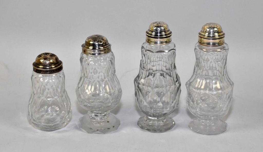 FOUR SILVER MOUNTED PANELED CLASS CRUETS. Largest: