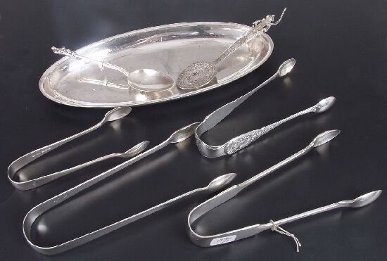 SoldTwo Georgian Sugar Nips18th C. One with scallop shell nips, 4-1/2"l. Together with a silver-plated slotted spoon, a sterling luncheon fork, sterling S. Kirk salt spoon, a coin silver master salt "crew", four sterling teaspoSee Sold Price