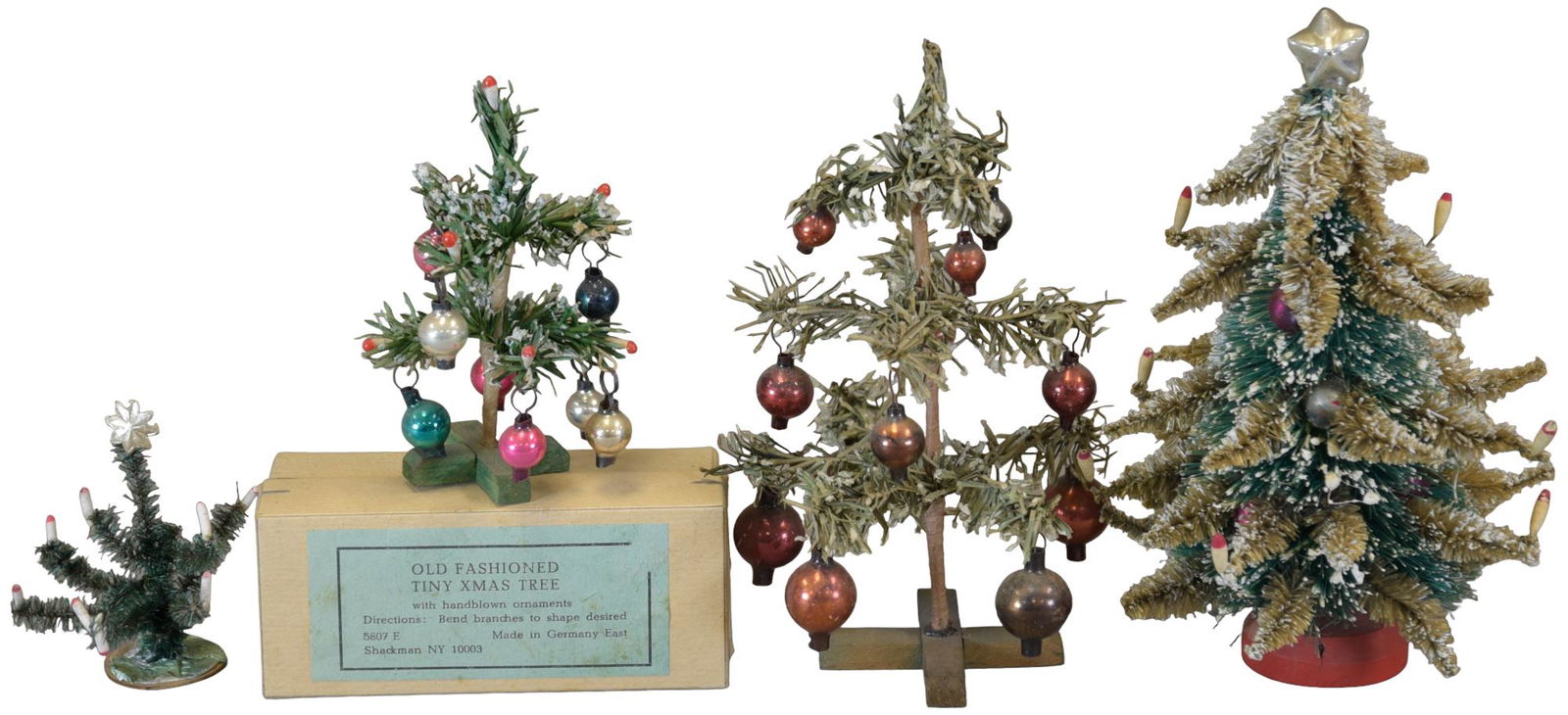 FOUR SMALL DECORATED CHRISTMAS TREES