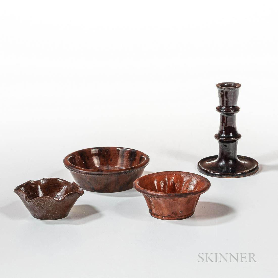 Four Small Glazed Redware Household Items, northeastern
