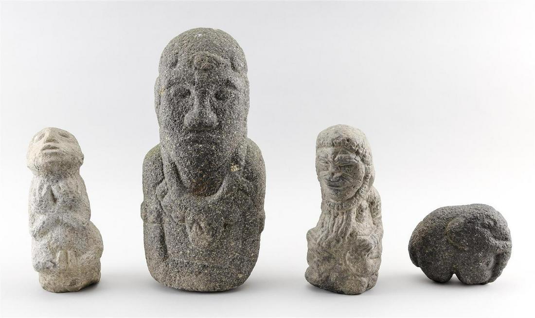 FOUR STONE GARDEN ORNAMENTS Three standing primitive