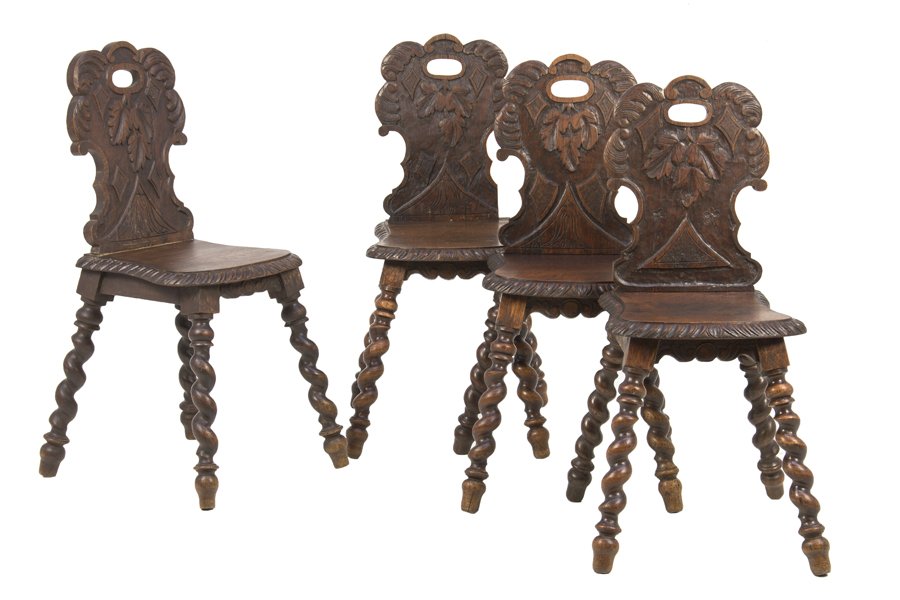 FOUR TYROLEAN CARVED OAK CHAIRS