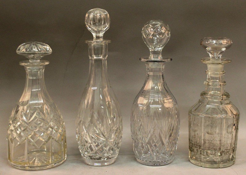 FOUR VARIOUS DECANTERS AND STOPPERS.
