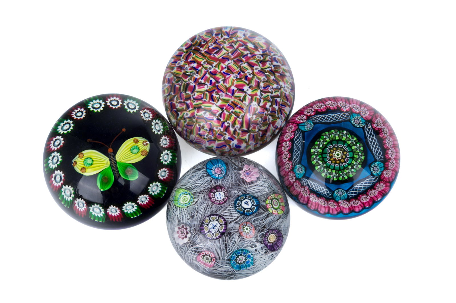 FOUR VINTAGE GLASS PAPERWEIGHTS