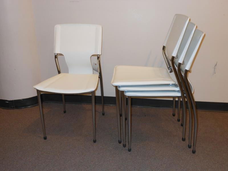 FOUR WHITE LEATHER AND CHROME STACK CHAIRS