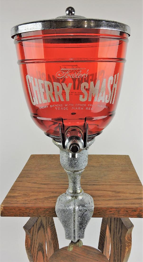 SoldFOWLER'S CHERRY SMASH SODA FOUNTAIN.Cherry Smash syrup dispenser with original pump. CONDITION: Free of chips, breaks and cracks. Good colors. Cherry Smash is one of the most colorful and sought-after pieces in the category. Condition:See Sold Price