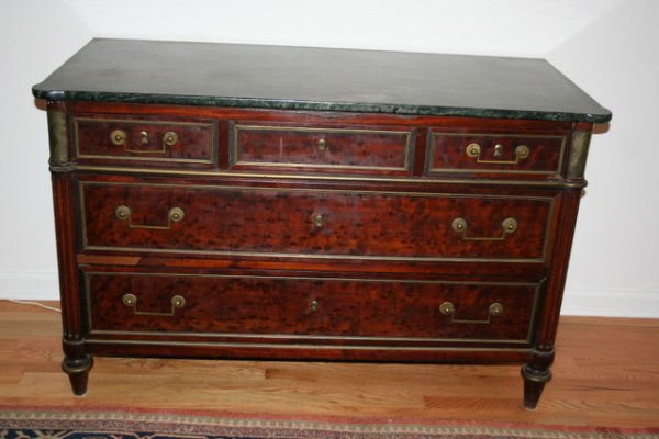 SoldDirectoire Ormolu-Mounted Mahogany CommodeDirectoire ormolu-mounted mahogany commode, ca. 1800, the rectangular green and white marble top above a conforming case with rounded quoins above three drawers, the columnar quoins fluted and stop flSee Sold Price