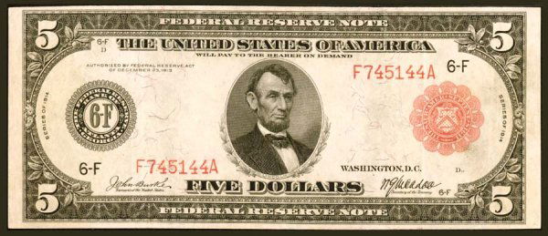 (935*) 1914 $5 FEDERAL RESERVE STAR NOTE FR.867a* ATLANTA PCGS VF 20 VERY FINEMar 03, 20261928A $5 Legal Tender Note FR#1526 PCGS Gem 65 PPQFeb 28, 20261914 $5 Federal Reserve Note New York PCGS VF20 Certified1 day Left1914 New York $5 Federal Reserve Note PMG VF354 days Left1928D $5 Legal Tender Note Fr# 1529 PCGS Superb Gem 67 PPQ1 day Left1929 United States $5 The Citizens National Bank Of Washington Pennsylvania National Currency Note6 days LeftSeries Of 1917 United States $1 Large Size Legal Tender Note6 days LeftUS 1914 $10 Federal Reserve Note, Cleveland, Fr-919A1914 $5 Federal Reserve Note Type 833b PMG F15 New York3 days Left1928E $5 Legal Tender Note FR#1530 PCGS Superb Gem 67 PPQFeb 28, 20261928B $5 Legal Tender Note Fr# 1527 PMG MS65 Uncirculated1 day LeftThree 1914 Federal Reserve Notes: $5, $10, and $20Mar 10, 2026(3) Fed Reserve Notes- $5, $10, and $505 days LeftGold 1914 $5 Federal Reserve Note New York FR#833b PMG VF20 GCCMar 04, 20261928C $5 Legal Tender Note Fr# 1528 PMG MS64 Uncirculated4 days Left1929 T-1 $5 National Bank Note Cleveland Ohio Ch #4318 Uncertified6 days Left