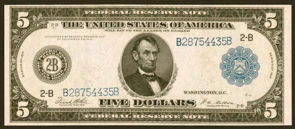 1914 $5 Federal Reserve Note Type 833b PMG F15 New York