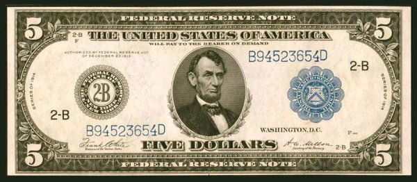 Lot of Two Consecutive 1914 $5 Chicago FRN PMG 455 days Left1914 New York $5 Federal Reserve Note PMG VF356 days LeftThree 1914 Federal Reserve Notes: $5, $10, and $20Mar 10, 20261914 $5 Federal Reserve Note Type 833b PMG F15 New York5 days LeftYork Nebraska National Note and 1917 $2 NoteMar 10, 20261929 T-1 $5 National Bank Note Richmond NB Charter 11655 New York20 hrs LeftGold 1914 $5 Federal Reserve Note New York FR#833b PMG VF20 GCCMar 04, 20261929 Type 2 $5 National Bank Note Clayton New York Charter 5108 F VFFeb 28, 20261928A $5 Legal Tender Note FR#1526 PCGS Gem 65 PPQFeb 28, 20261929 $5 Type 1 Chase National Bank NY PMG VF30 Certified18 hrs Left1914 $5 Federal Reserve Note New York PCGS VF20 Certified3 days Left1929 United States $5 The Citizens National Bank Of Washington Pennsylvania National Currency NoteFeb 27, 2026Series 1929 Five Dollar Brown Seal National Currency Note1928E $5 Legal Tender Note FR#1530 PCGS Superb Gem 67 PPQFeb 28, 2026Series 1929 United States $5 The First National Bank In East Chicago Indiana National Currency NoteFeb 27, 20261929 T-1 $5 National Bank Note Oakdale PA Ch #5327 Circulated5 days Left