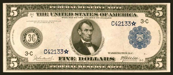 (935*) 1914 $5 FEDERAL RESERVE STAR NOTE FR.867a* ATLANTA PCGS VF 20 VERY FINEMar 03, 20261929 United States $5 The Citizens National Bank Of Washington Pennsylvania National Currency NoteFeb 27, 2026Series 1929 United States $5 The First National Bank In East Chicago Indiana National Currency NoteFeb 27, 2026(779*) 1914 $5 FEDERAL RESERVE STAR NOTE FR.871a* CHICAGO PCGS CERTIFIED 12 FINEMar 04, 2026(224* 1950 D $50 FEDERAL RESERVE NOTE ATLANTA FR.2111-F* STAR NOTE PCGS 35 CH VF5 days Left1928A $5 Legal Tender Note FR#1526 PCGS Gem 65 PPQFeb 28, 20261914 $5 Federal Reserve Note New York PCGS VF20 Certified3 days Left(3) Fed Reserve Notes- $5, $10, and $507 days LeftGold 1914 $5 Federal Reserve Note New York FR#833b PMG VF20 GCCMar 04, 20261963 United States $5.00 Red Seal Silver Certificate Star NoteFeb 27, 2026(955*) 1934 C $10 FEDERAL RESERVE STAR NOTE ST. LOUIS FR.2008-H* PCGS CU 63 PPQ4 days Left1914 $20 Federal Reserve NoteMar 10, 2026PPQ 1928B $5 Legal Tender Note FR#1527 PCGS Gem 65Feb 28, 20261928E $5 Legal Tender Note FR#1530 PCGS Superb Gem 67 PPQFeb 28, 2026(2) 1953 & 1953-A United States $5.00 Silver Certificate Star NotesFeb 27, 2026USA 1981 $1 Federal Reserve Note – Series G05066498F3 days Left