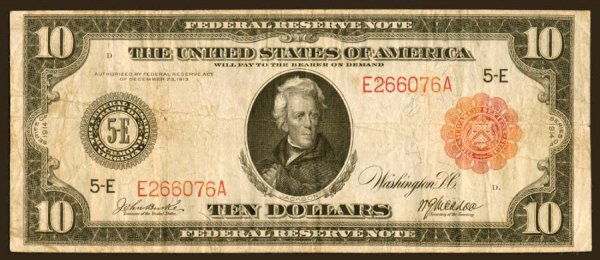 $10 1914 Federal Reserve Note FR 911 A Circulated VF