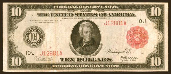 $10 1914 Federal Reserve Note FR 911 A Circulated VF