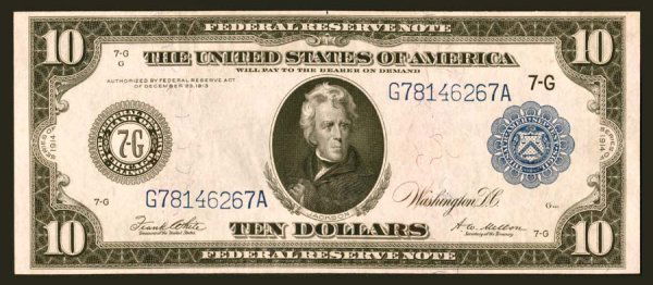 $10 1914 Federal Reserve Note FR 911 A Circulated VF