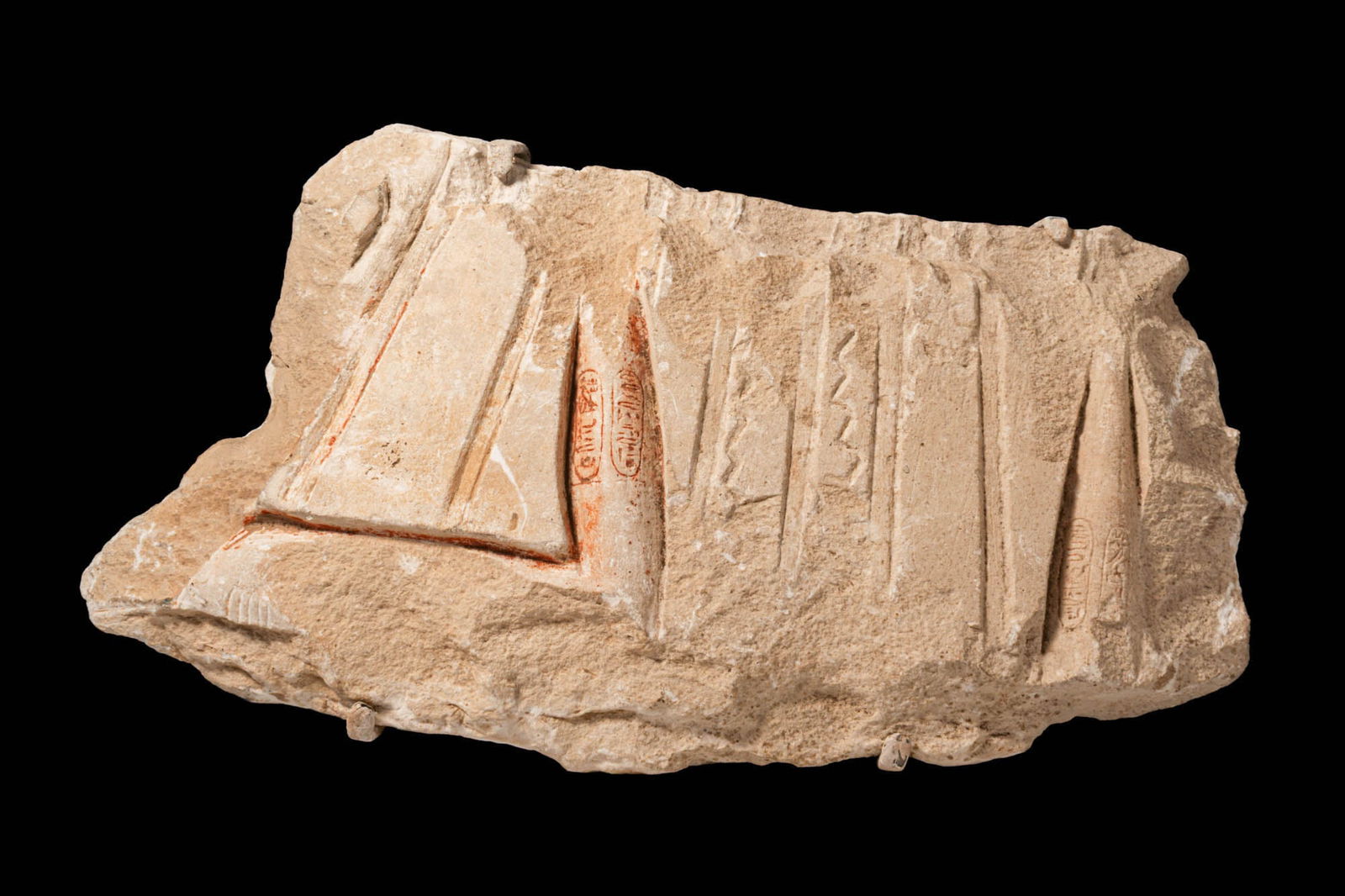 FRAGMENT OF A SUNK RELIEF DEPICTING THE PHARAOH AKHENATEN ADORING THE SOLAR DISC ATEN