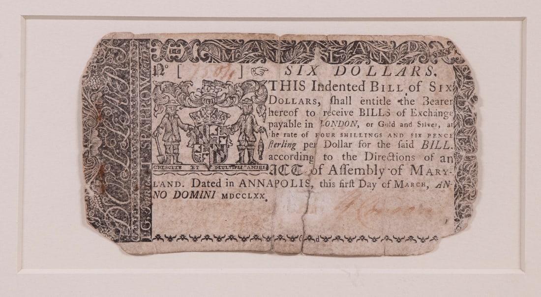 FRAMED 1770 MARYLAND SIX-DOLLAR COLONIAL NOTE
