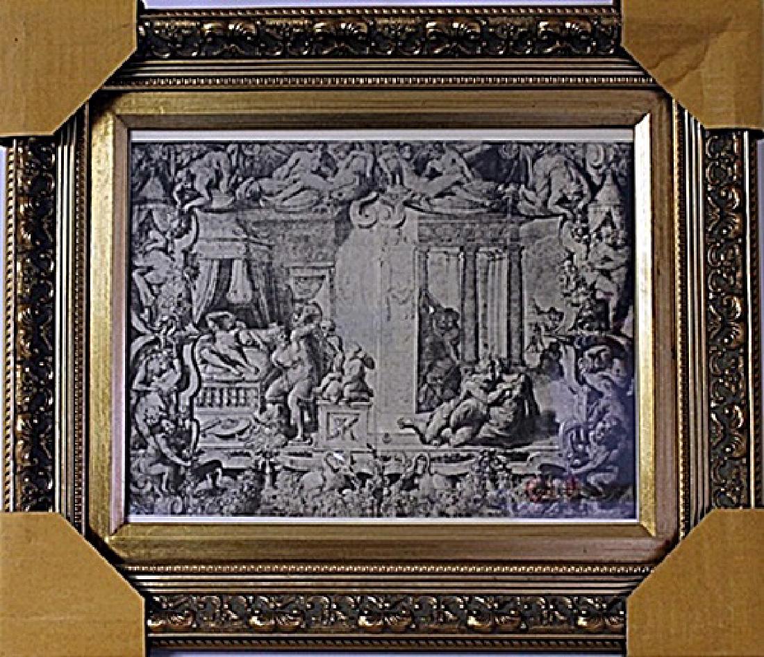 Sold16th C Italian Framed Engraving "Rape of Sabines"An engraving black and white panel depiction of the "Rape of the Sabines" in the 16th century style. Now with shrinkage into strips and with losses to the image. Framed by an important inset and LapisSee Sold Price