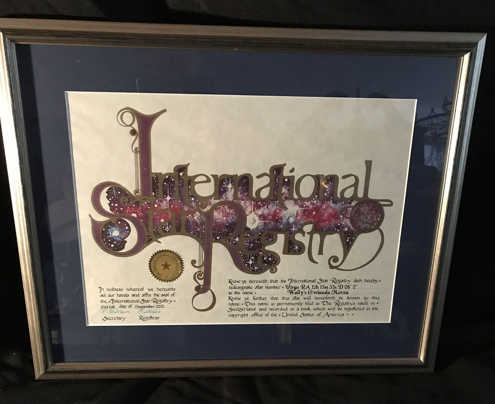 Framed international star registry certification